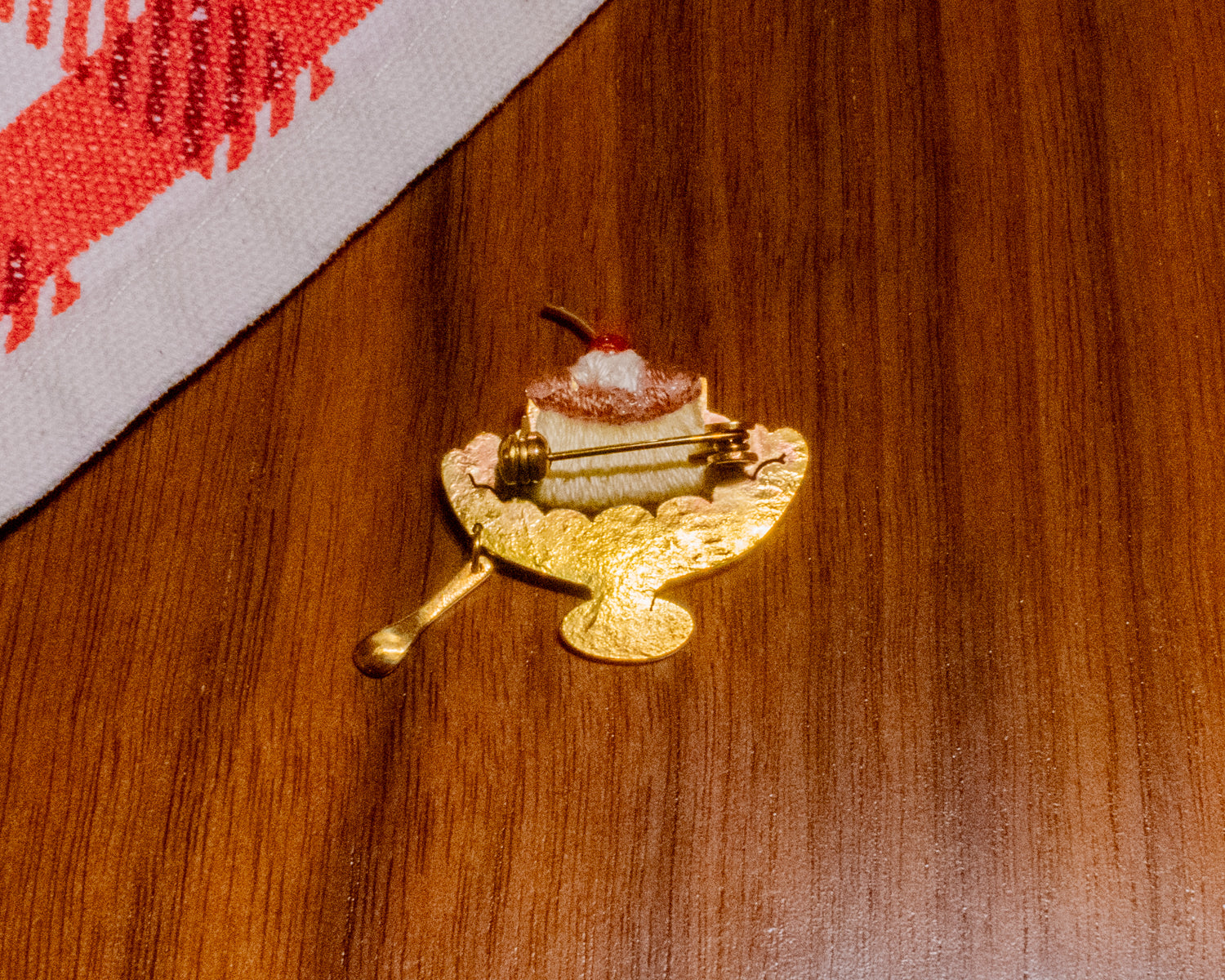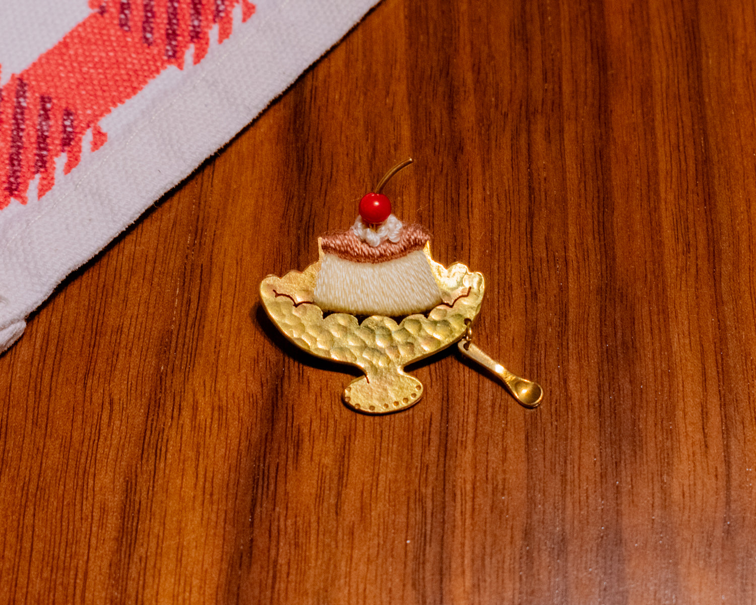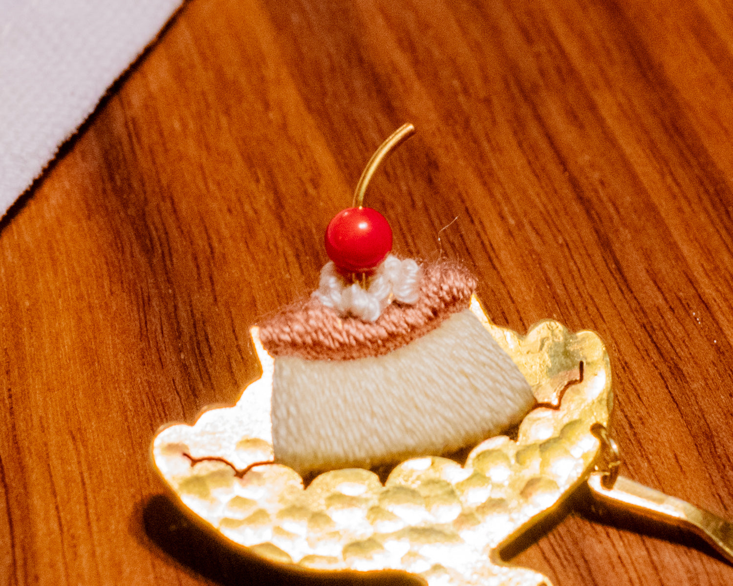 A sweet pudding embroidery brooch complete with a tiny little spoon!