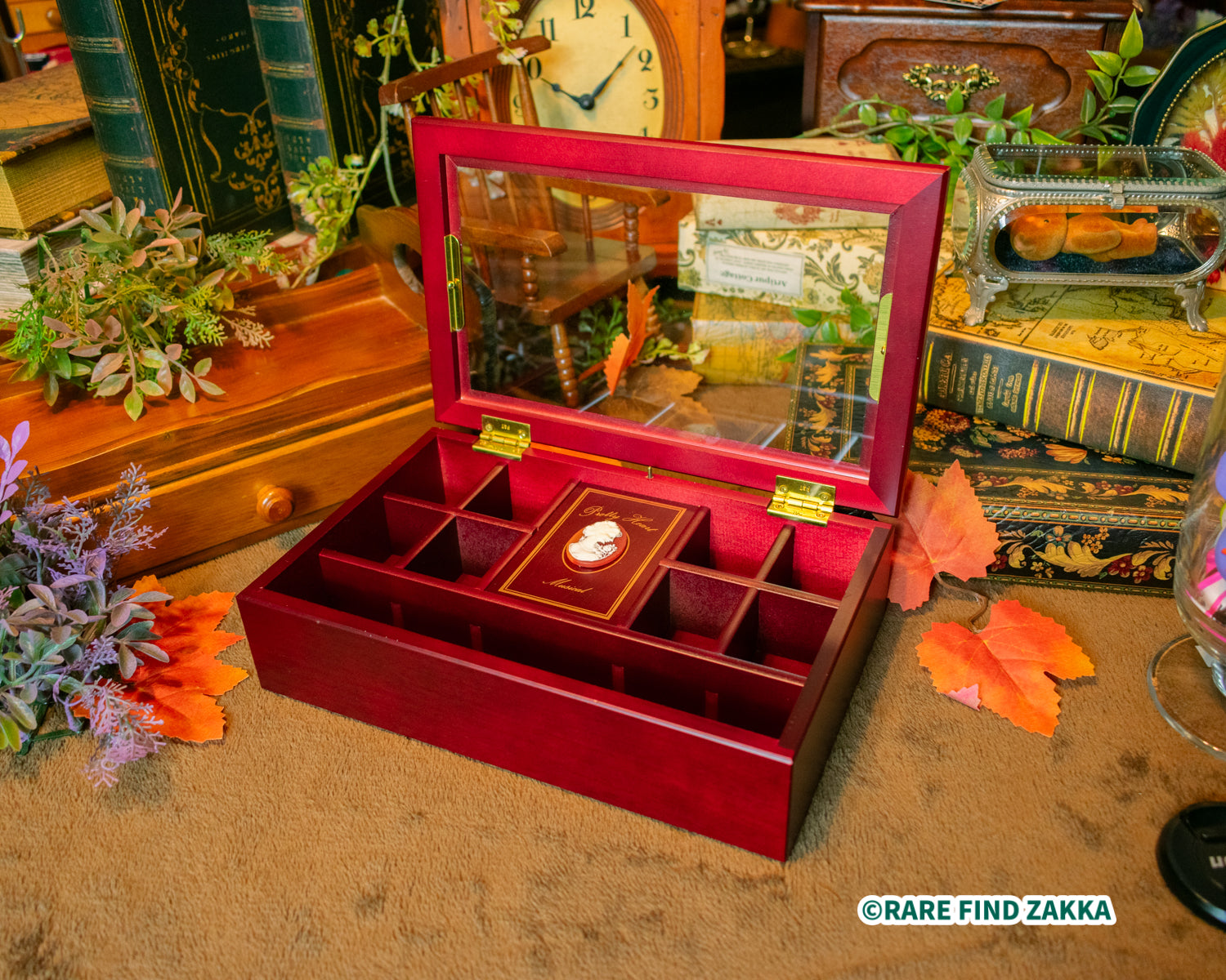 At the heart of this vintage music jewelry box is a raised resin cameo decoration, marked “Pretty Heart Musical.” It is flanked by multiple compartments designed for rings, earrings, and keepsakes, all elegantly displayed beneath a glass lid. The box itself is finished in a deep crimson wood, embodying the charm of classic European-inspired design with a warm nostalgic touch.