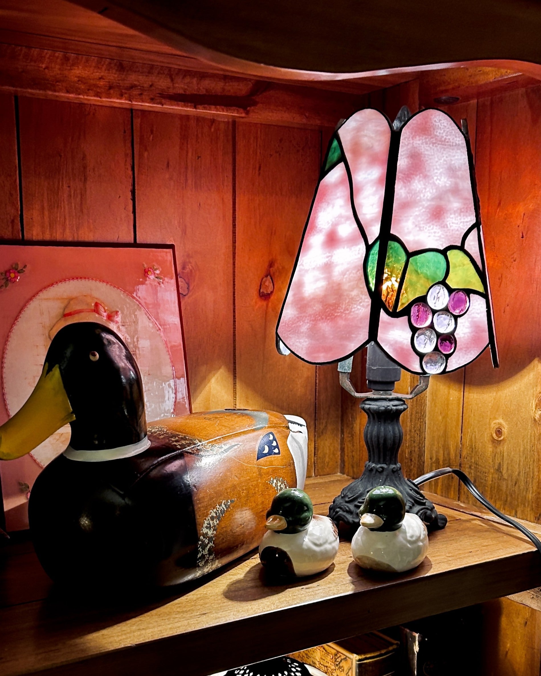 A charming and rather rare grape-themed stained glass table lamp featuring a soft purple glow that beautifully mimics the color of ripe grapes. When paired with wooden furniture or warm interiors, the light creates a deep maroon ambiance with an exotic and slightly sensual vintage atmosphere.