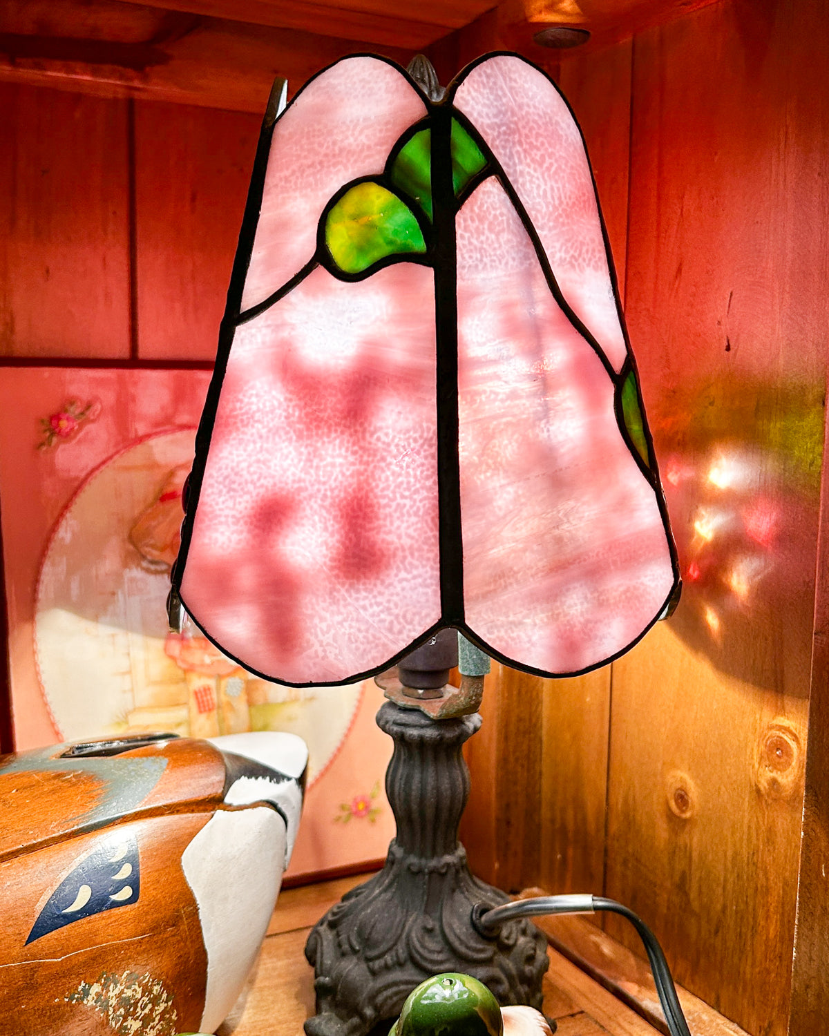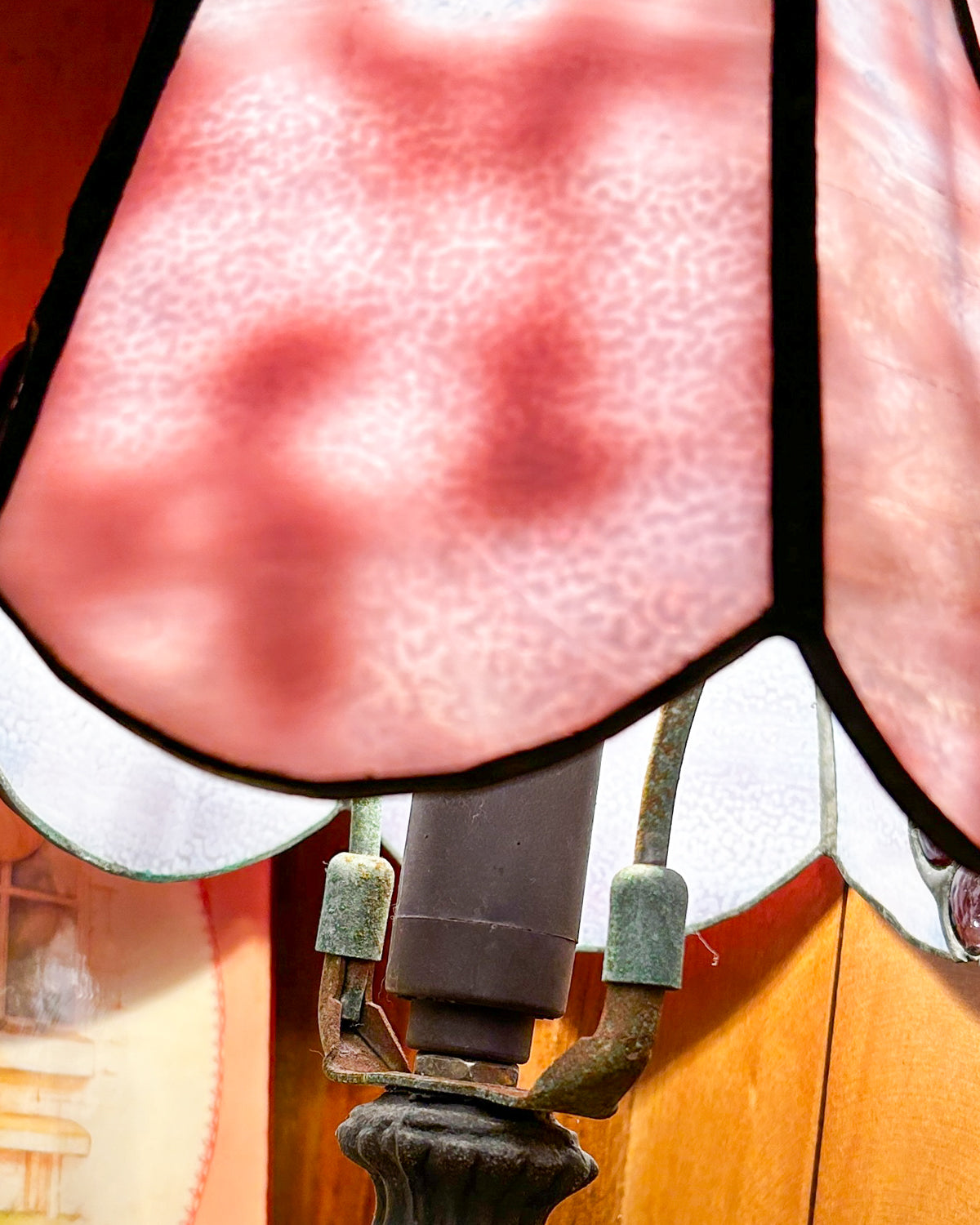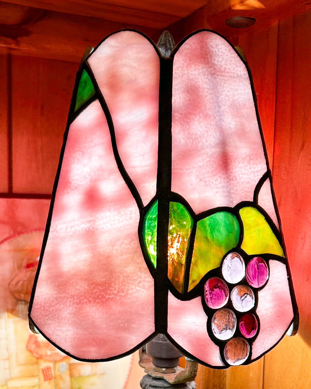 This lamp was produced using a traditional stained-glass style manufacturing process. Some panels show visible straight cut lines, and the paint on the glass may display slight unevenness or areas of translucency. These are normal characteristics of this type of lamp and contribute to its handcrafted aesthetic and vintage charm.